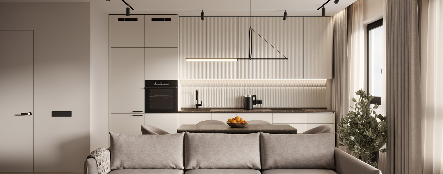 Прямая кухня с высокими колонками под встроенный холодильник и духовой шкаф. Матовые фасады Тинто на колонках и столах, и матовые фасады Регина на шкафах. Столешница из кварцевого агломерата с мойкой подстольного монтажа. Правее от мойки расположена варочная поверхность и врезная вытяжка в шкаф. Для освещения рабочей зоны под шкафами установлен угловой профиль со светодиодной лентой.