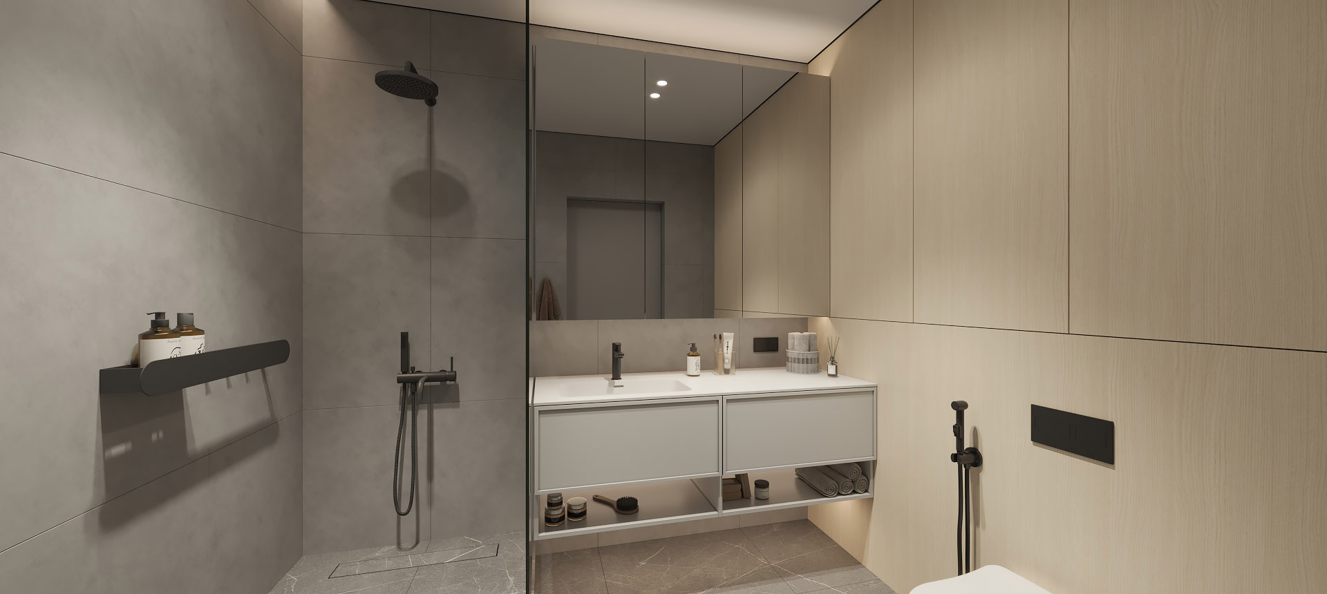 «У меня все проекты с компанией («Стильные Кухни и Интерьеры) были хорошие, но мебелью в ванную комнату я довольна больше всего на свете. Мне сделали тумбу под раковину, две навесные колонки по бокам, зеркало с подсветкой, а также встроенный шкаф напротив. Из-за высоты потолков и размеров шкафов было непросто спроектировать все так, как надо: были опасения, что дверцы ослабнут, что тяжелые дверцы нельзя будет открывать одним легким нажатием. Но в итоге в фасады добавили направляющие, которые их усиливают. И еще удалось сделать эти высокие двери с механизмом push-to-open. У меня не очень большая площадь ванной, поэтому хотелось обойтись без лишних деталей, в том числе и выступающих ручек, которые я бы постоянно задевала»,