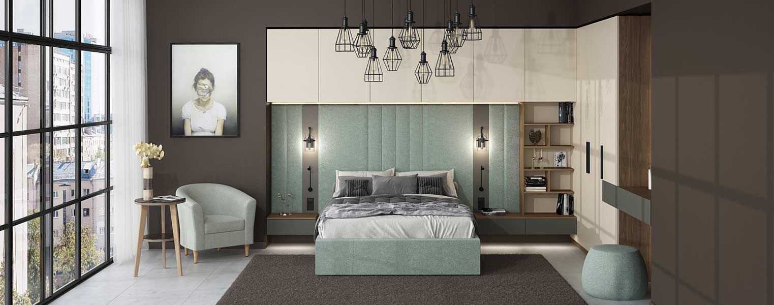 Трёхстворчатых распашной шкаф в спальню представлен в бежевых тонах в сочетании с тёмно-серыми модулями и открытыми секциями древесного декора. Вся мебель выполнена в матовой отделке. Есть консольная полка с ящиками и навесным зеркалом. Шкаф оснащён полками, ящиками, штангами для удобного хранения вещей. Есть дополнительные секции с открытыми полками и прикроватной тумбой.