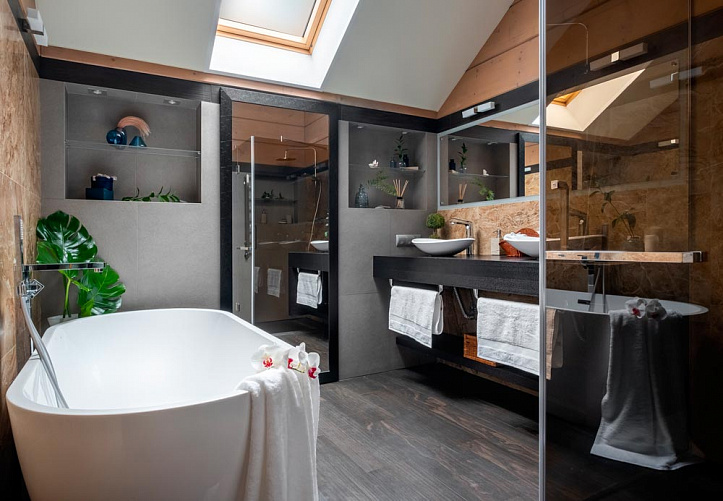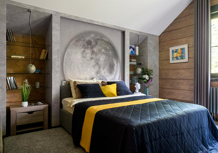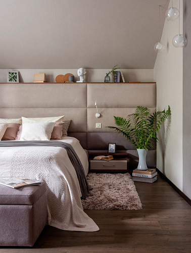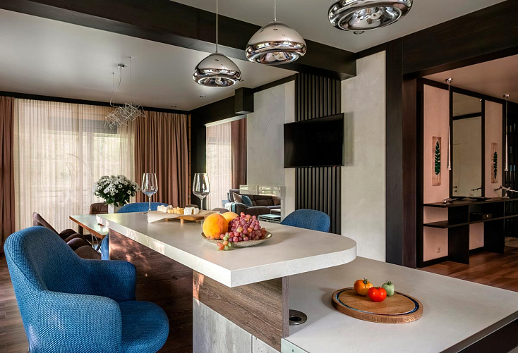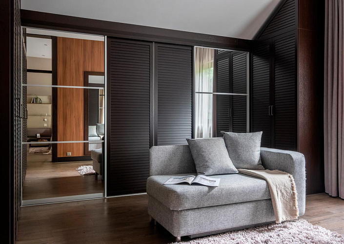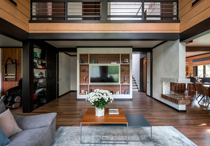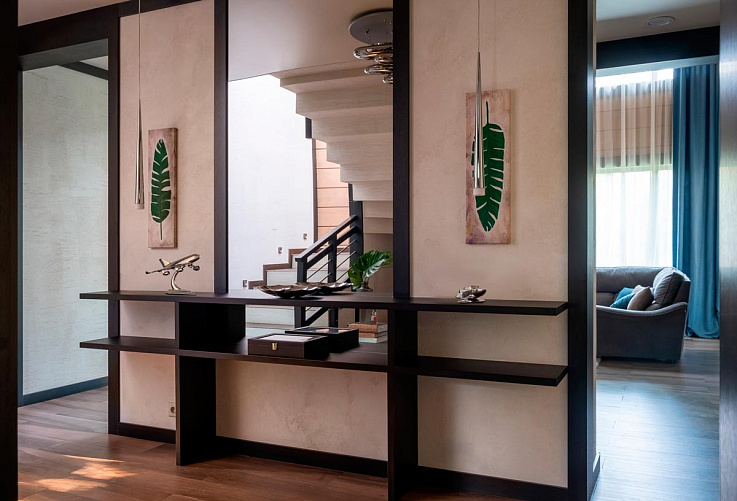 Первый этаж — воплощение идеального сценария, образа жизни заказчиков: в эргономичном и презентабельном холле удобно встречать гостей, уютная кухня-столовая располагает к кулинарному творчеству и непринужденным беседам, а в просторной гостиной предусмотрено все для отдыха за просмотром кино или игры в бильярд. Идея проекта заключалась в разделении пространства на зоны, плавно перетекающих друг в друга, объединяя при этом всех, кто находится в доме. На втором этаже приватная зона — мастер-спальня, с просторной гардеробной и собственным санузлом, спальня сына и гостевая спальня с вместительными встроенными шкафами, фасады которых после монтажа были отделаны декоративной штукатуркой, чтобы максимально органично вписаться в интерьер.